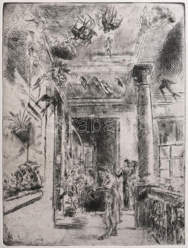 Beschreibung: Aszódi Weil Erzsébet (1901-1976): Fecskék a lépcsőházban. Rézkarc, papír, jelzett a karcon. 26×19,5 cm