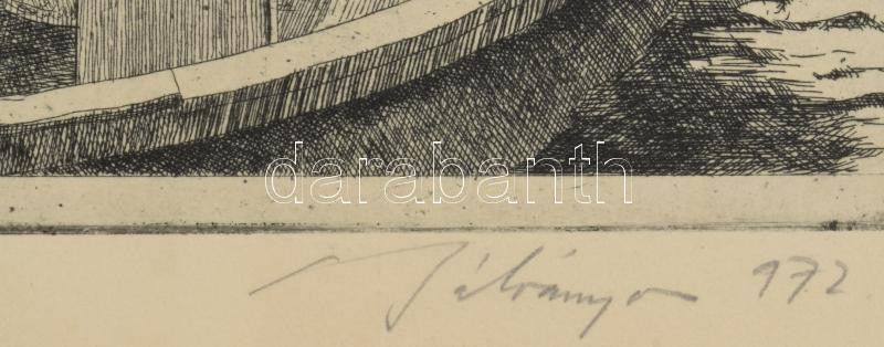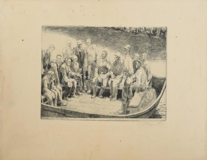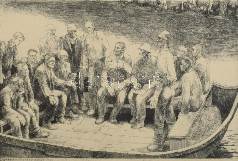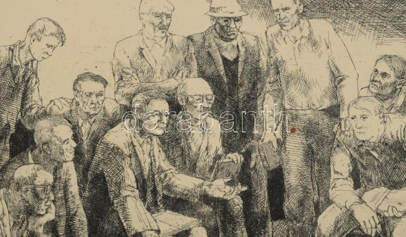 Beschreibung: Bálványos Huba (1938-2011): Megalakul a Nemzeti Parasztpárt, 1939. Rézkarc, papír, jelzett. Kartonon. Lap széle kissé foltos. 19x29,5 cm