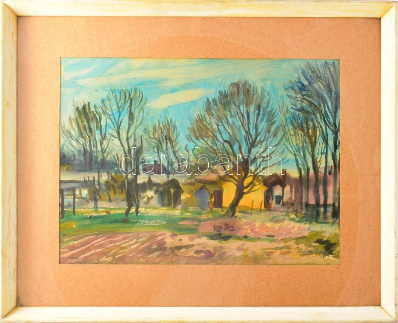 Beschreibung: Bóka Dezső (1935-): Hideg nap, 1969. Akvarell, papír, jelzett. Hátoldalán Képcsarnok Vállalat címkéjével. Üvegezett fakeretben, 33x45 cm.