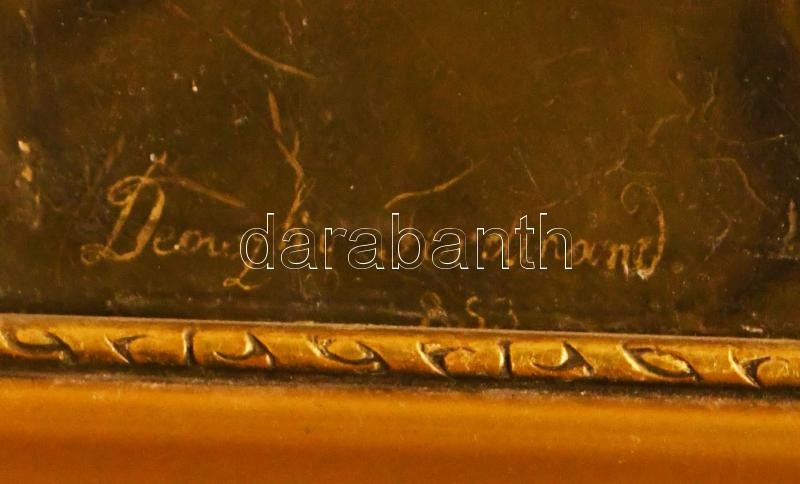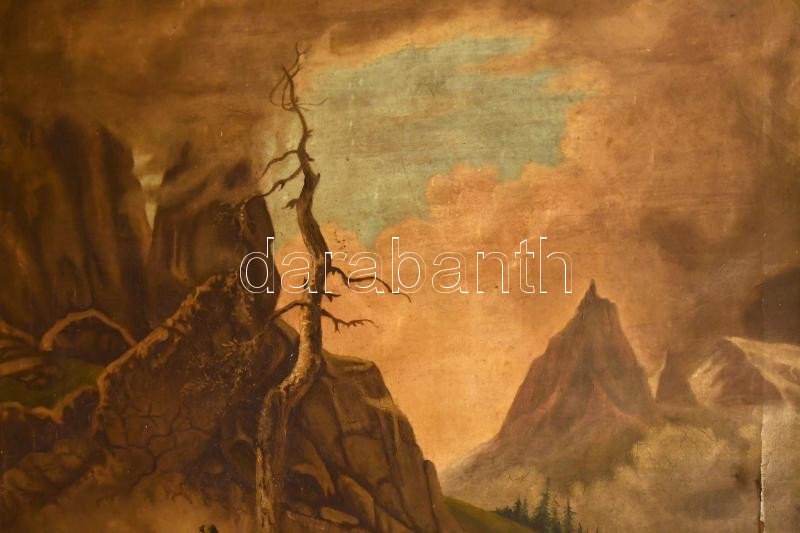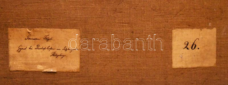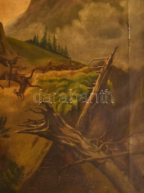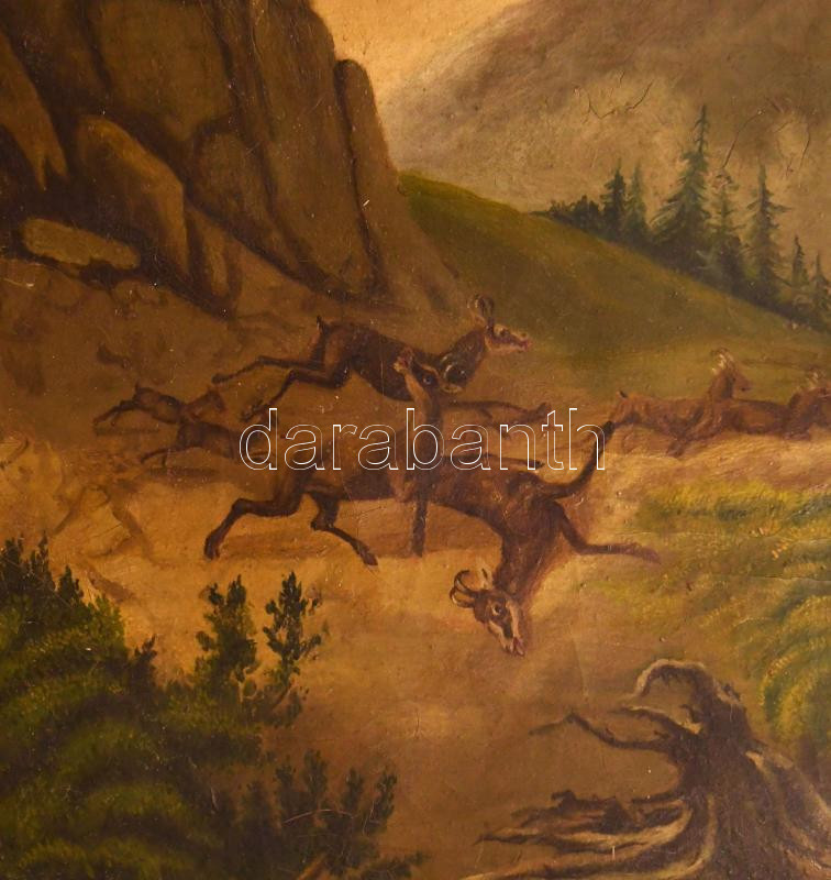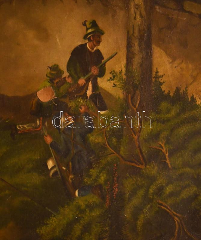 Demszky Ferdinánd (működött a XIX. sz. közepén, 1854-ben Kassán jogi diplomát szerzett): Vadászok Salzburg környékén, 1853. Olaj, vászon. Jelezve balra lent. Hátoldalán korabeli címkén német nyelven feliratozott. Sérült. Dekoratív fakeretben. 91,5x76,5. Gyűjtői ritkaság!
