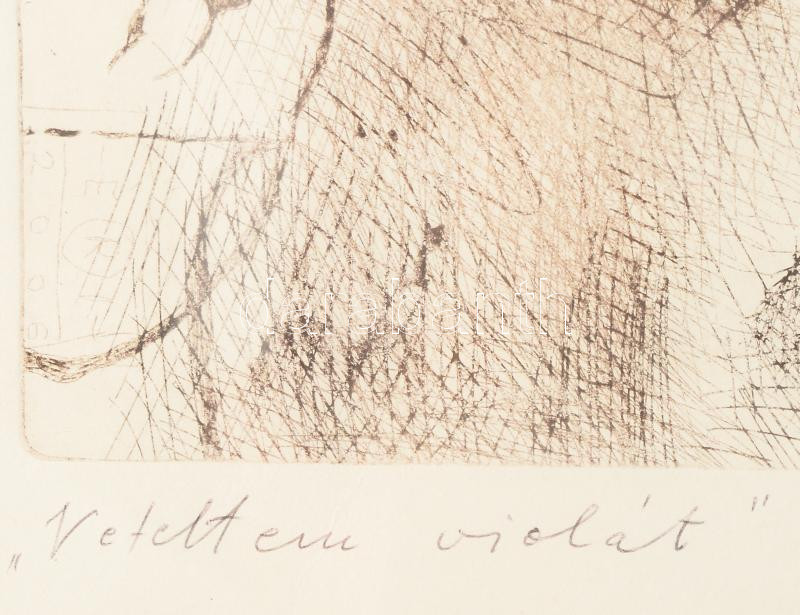 Beschreibung: Éri Jenő Tamás (1958-): "Vetettem violát" (Bartók Béla), 2007. Rézkarc, papír, jelzett, üvegezett fakeretben. 20x30 cm