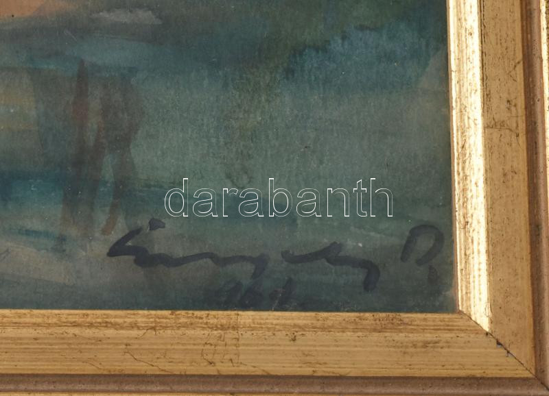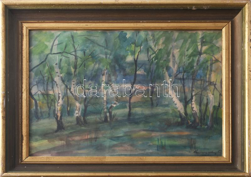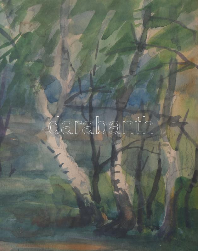 Beschreibung: Gergely Pál (-): Nyírfák, 1961. Akvarell, papír, jelzett. Hátoldalán Képcsarnok Vállalat címkéjével. Üvegezett fakeretben, 28,5×38,5 cm
