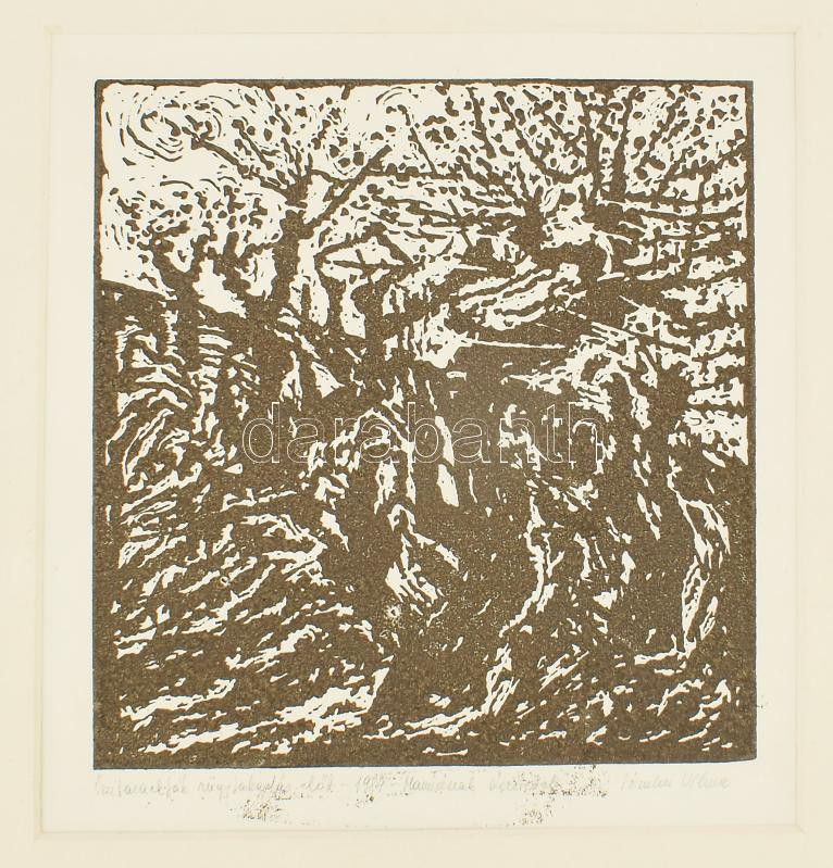 Beschreibung: Somlai Vilma (1938-2007): Őszibarackfák rügyfakadás előtt, 1984. Linómetszet, papír, jelzett, Supka Magdolna (Manna) művészettörténésznek ajánlott. Paszpartuban. 20×20 cm
