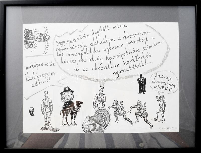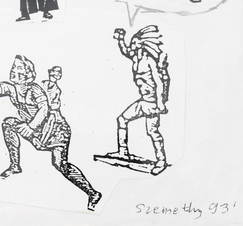 Szemethy Imre (1945-): (...) sűrűn depilált múzsa (...), 1993. Vegyes technika, kollázs, papír, jelzett. Megjelent az Élet és Irodalom c. folyóiratban. Üvegezett fakeretben, 21x29,5 cm