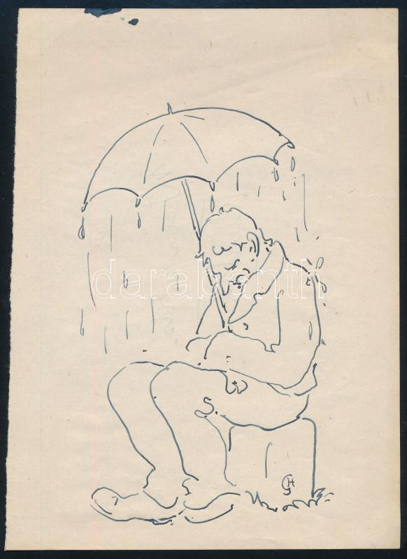 Beschreibung: GH jelzéssel (Glatz Henrik?): Esernyős esőben. Tus, papír, 21x15 cm