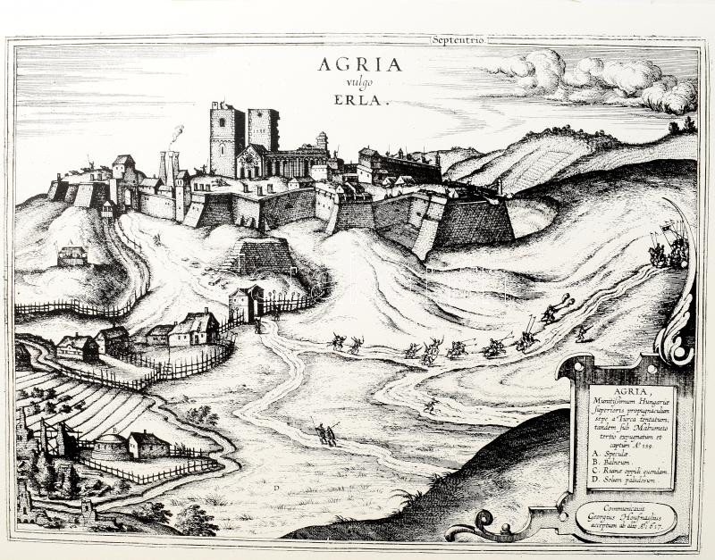 Jelzés nélkül: Agria vulgo Erla (Eger), régi metszet után készült modern szitanyomat, papír, 33x46 cm