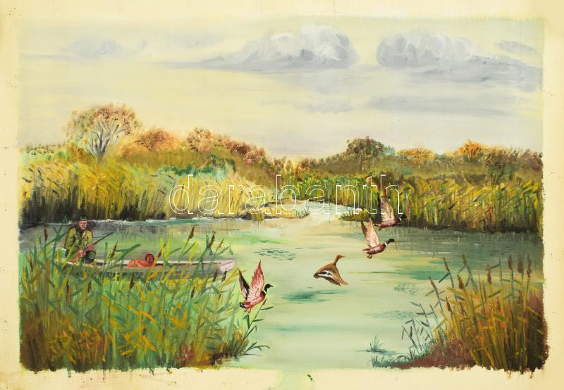 Jelzés nélkül, XX. sz. második fele: Vadkacsákat leső vadász kutyájával. Olaj, vászon. Feltekerve, vakráma nélkül. 49x66 cm