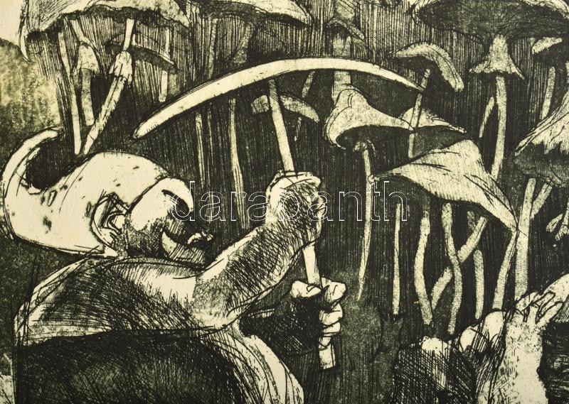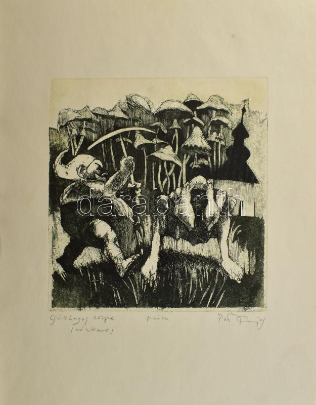 Beschreibung: Olvashatatlan jelzéssel: Csákányos törpe. Rézkarc, papír. Próbanyomat. 24,5x23 cm