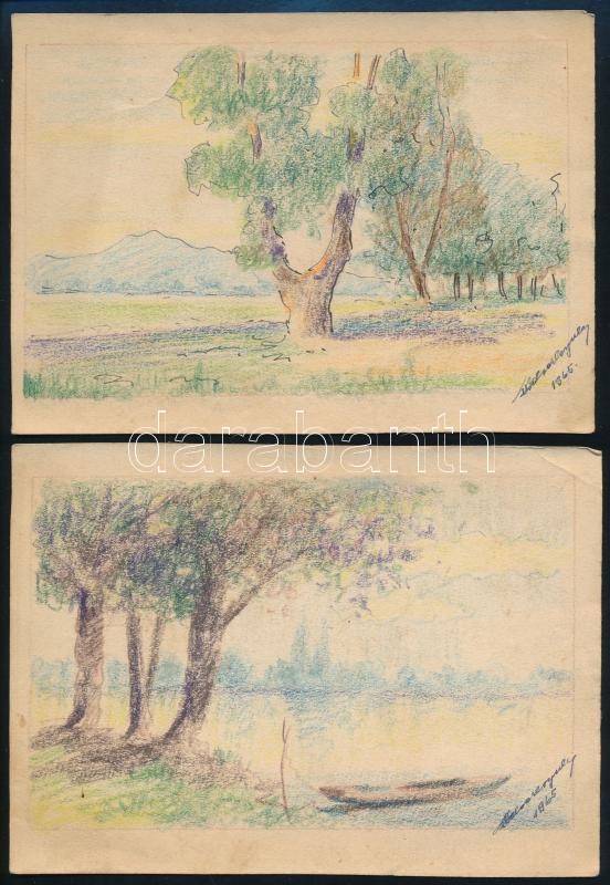 Olvashatatlan jelzéssel (Halvax Gyula?), 2 db mű: Vízpart és hegyvidéki táj. Vegyes technika, papír, 9x14 cm