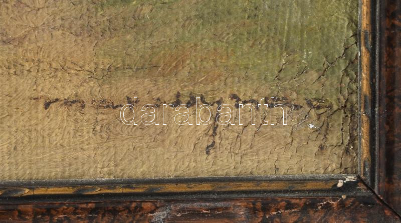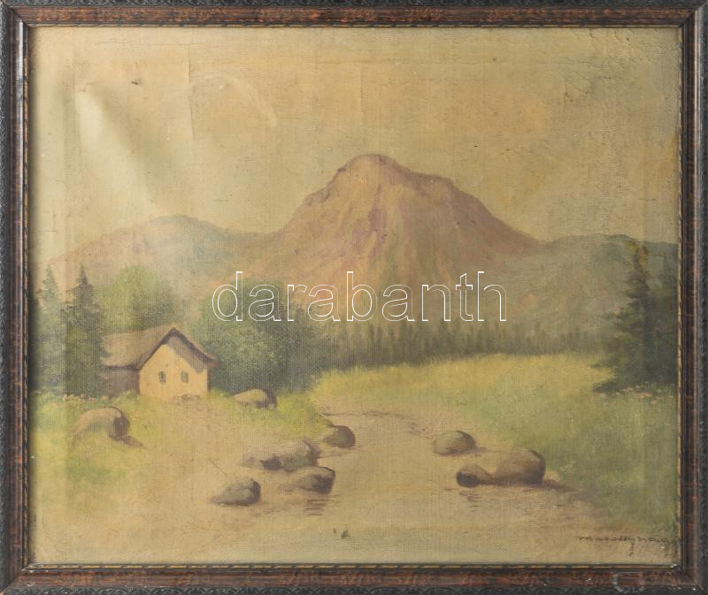 Olvashatatlan jelzéssel: Hegyvidéki táj. Olaj, vászon, kissé sérült. Dekoratív fakeretben, 39x47 cm