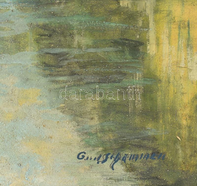Olvashatatlan jelzéssel: Hegyvidéki tó. Olaj, karton. Dekoratív, egyik sarkában kissé sérült fakeretben. 50×70 cm.