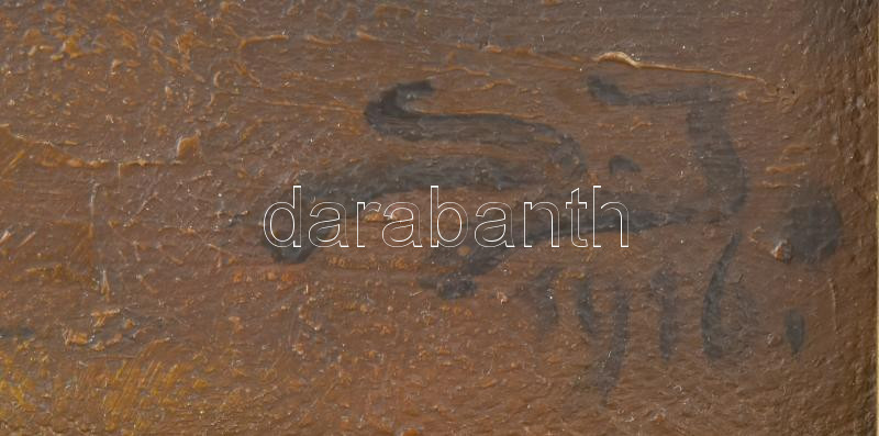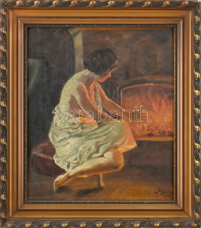 Olvashatatlan jelzéssel: NÅ‘i félakt a kandallónál, 1911. Olaj, vászon. 42x36 cm. DekoratÃv, régi, kissé sérült fakeretben, keret hátoldalán Schwartz Miksa pestszenterzsébeti képkeretezÅ‘ cÃmkéjével.