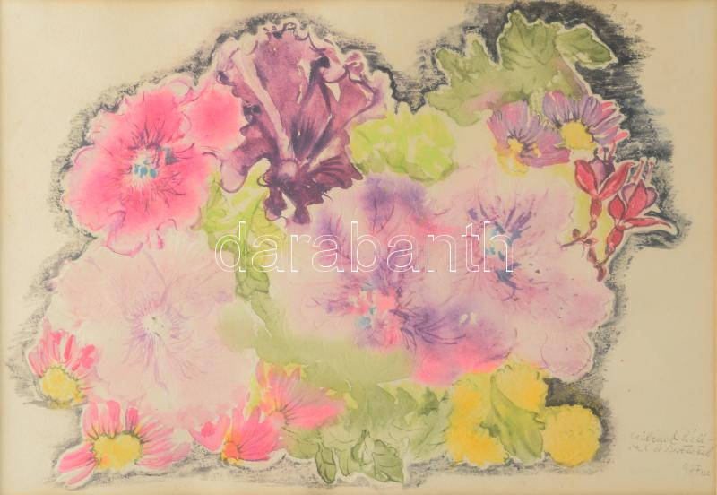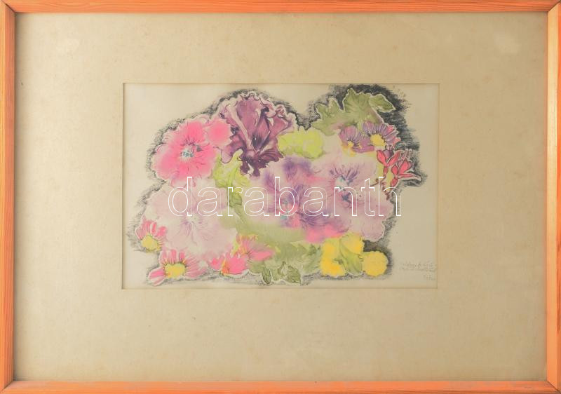 Olvashatatlan jelzéssel: Virágözön, 1977. Akvarell, papír. Ismeretlen autográf ajándékozási, Ury Ibolya "Csibi" (1924-2009), a Műcsarnok tudományos főmunkatársa részére. Proveniencia: Ury Ibolya (1924-2009), a Műcsarnok tudományos főmunkatársa hagyatékából. 21x31 cm. Üvegezett fakeretben / Litograph on paper, signed, framed, from the estate of art historian Ibolya Ury