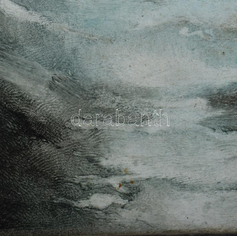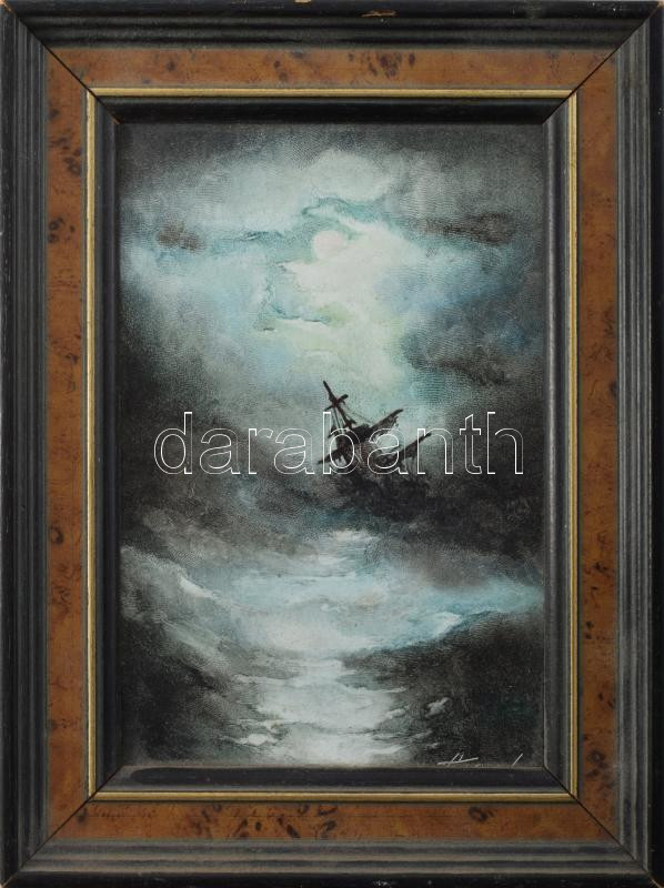 Olvashatatlan jelzéssel: Vitorlás viharban. Olaj, farost. Dekoratív, kissé kopott fakeretben, 15x10 cm.