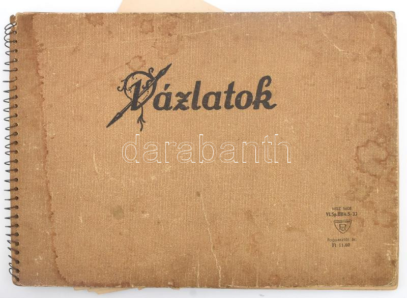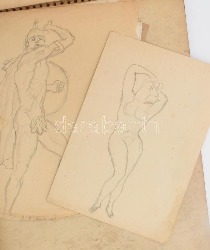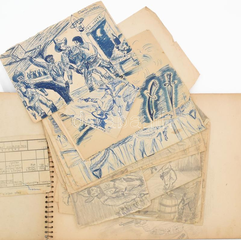 Olvashatatlan jelzéssel vagy jelzés nélkül, XX. sz. közepe-második fele: Vázlatfüzet 14 db rajzzal és további 25 db behelyezett rajzzal, többségében vadnyugati témájú, közte női aktok. Ceruza, golyóstoll, papír, néhány hátoldalán Gunesch + G bélyegzéssel, részben sérült, klf. méretekben
