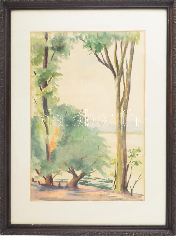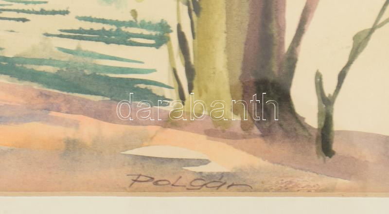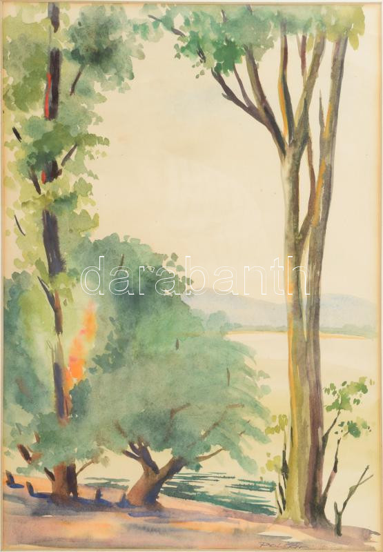 Polgár jelzéssel: Vízparti táj. Akvarell, papír, üvegezett fakeretben, 44×30 cm