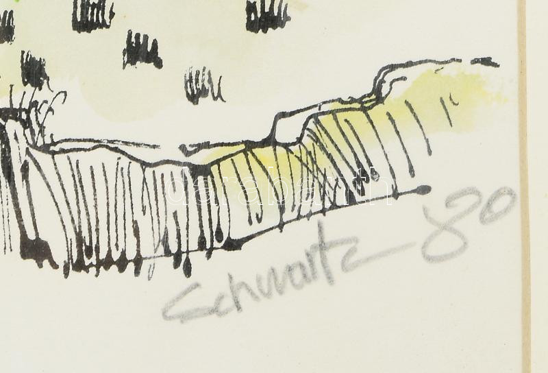 Schwartz jelzéssel: Város látképe. Színezett nyomat, papír, kissé foltos, üvegezett, kopott fakeretben, 35×47,5 cm