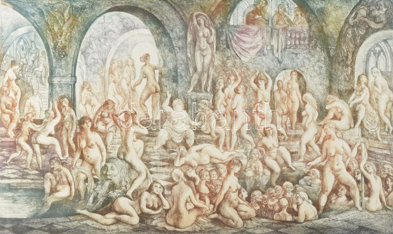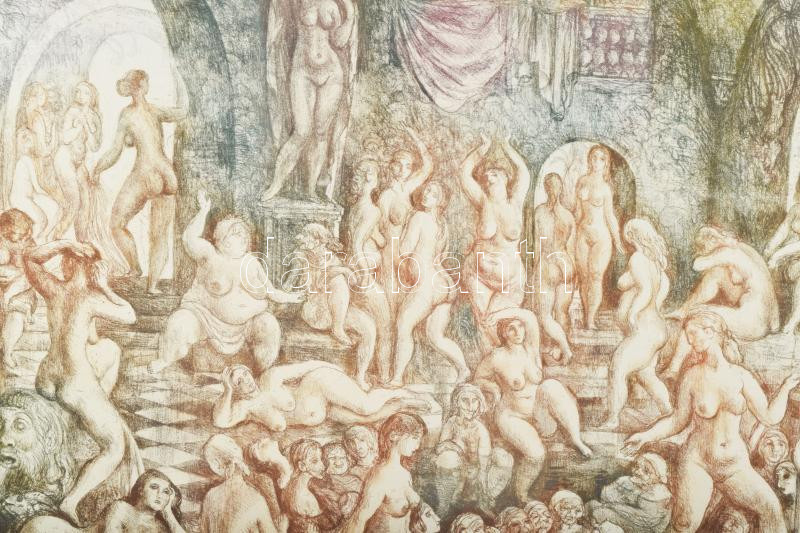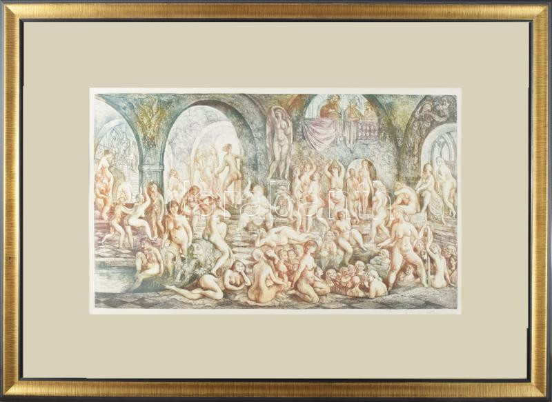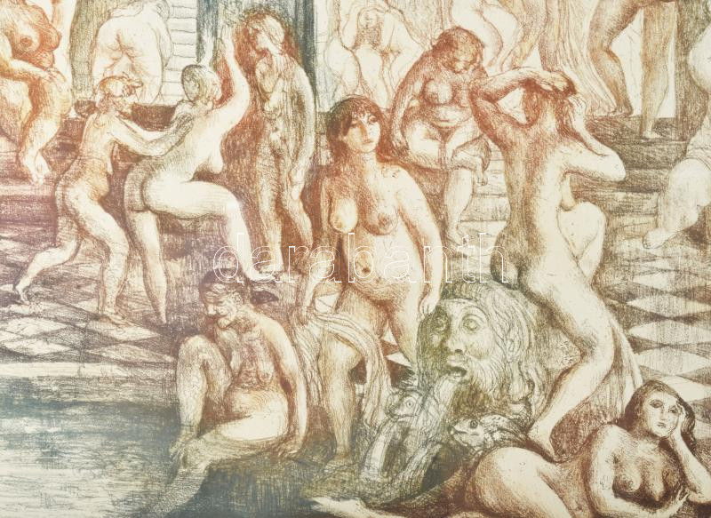 Szabó Vladimir (1905-1991): Fürdőző aktok. Színezett rézkarc, papír, utólagos (?) jelzéssel, üvegezett fakeretben. Hátoldalán Galéria Tabán címkéjén feliratozott. 28x49 cm