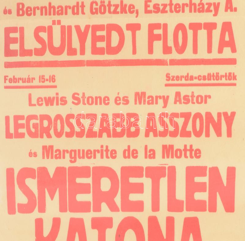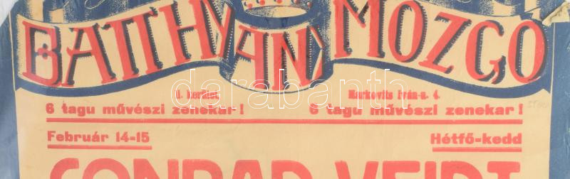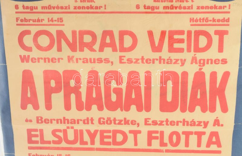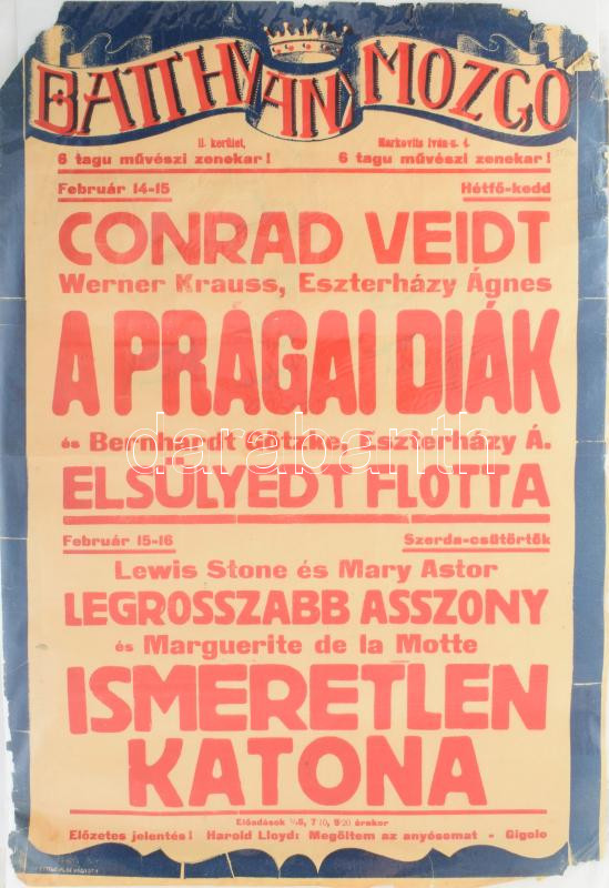 1927 Batthyányi Mozgó, Bp., II. ker, Markovits Iván u. 4. A prágai diák, többek közt Eszterházy Ágnes szereplésével; Ismeretlen katona stb. Színes art deco filmplakát, műsorplakát, papír, jelzés nélkül, Westend Klisé Váci út 1., sérült, hajtásnyomokkal, korábban feltekerve, 45x31,5 cm. Rendkívül ritka!