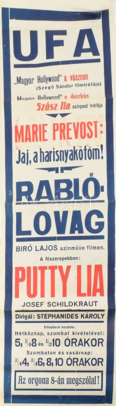 1927 UFA, Rablólovag, Putty Lia, "Magyar Hollywood" a vásznon. Színes filmplakát, műsorplakát, papír, jelzés nélkül, Kunossy Rt. Apró sérülésekkel, hajtásnyomokkal, korábban feltekerve, 92,5x31,5 cm. Rendkívül ritka!