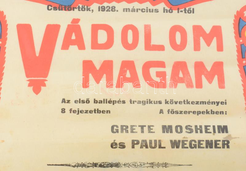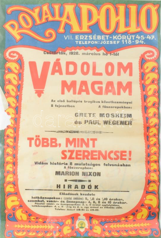 1928 Földes Imre (1881-1948): Royal Apolló, Erzsébet krt. 45-47. Színes litografált art deco filmplakát, műsorplakát, papír, jelzett a plakáton, Rothberger és Weisz nyomda, sérült, hajtásnyomokkal, korábban feltekerve, 45x31 cm. Rendkívül ritka!