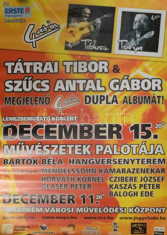 2007 Tátrai Tibor & Szűcs Antal Gábor, Latin, lemezbemutató ko... https://www.darabanth.com/de/514-Gemalde-Plakat-ex-libris-Auktion/516.0/Gemalde-und-Grafiken/Plakat~7/2007-Tatrai-Tibor-amp-Szucs-Antal-Gabor-Latin-lemezbemutato-koncertplakat-papir-felteker~II3459780