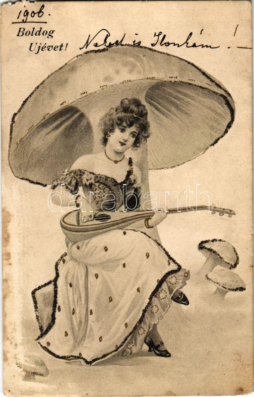 1905 Boldog Újévet / New Year greeting art postcard, lady with mushrooms. litho (b)