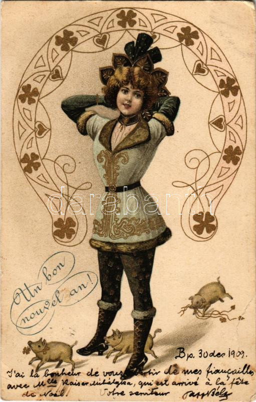 1909 Un bon nouvel an! / New Year greeting art postcard, lady with pigs. Art Nouveau, litho (EB)