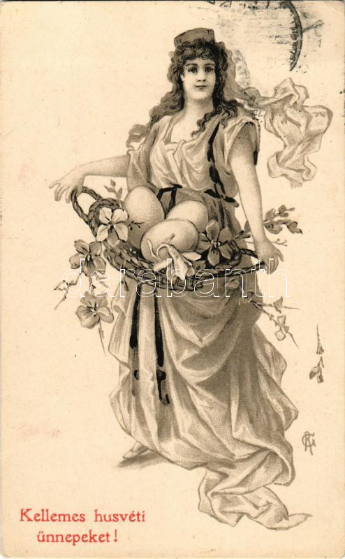 1910 Kellemes húsvéti ünnepeket / Easter greeting art postcard, lady with eggs. litho (EK)