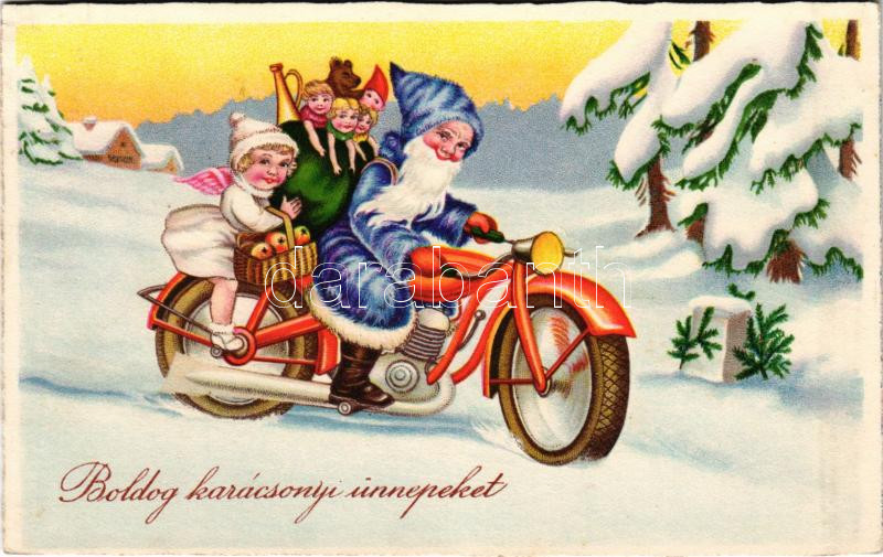 1937 Boldog karácsonyi ünnepeket! Mikulás motorkerékpáron / Christmas greeting art postcard, Saint Nicholas on a motorcycle. Amag 3061. (EK)