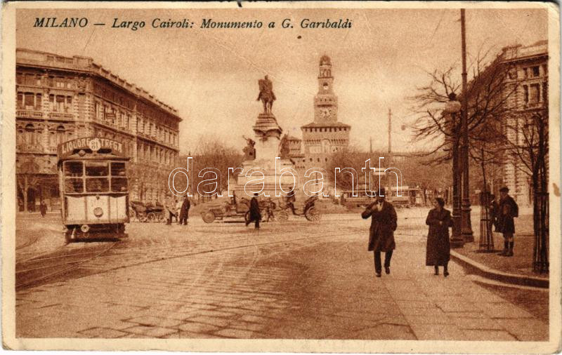 1928 Milano, Milan; Largo Cairoli, Monumento a G. Garibaldi / street view, monument, tram (EB)