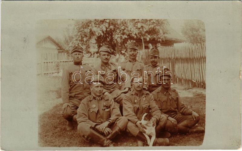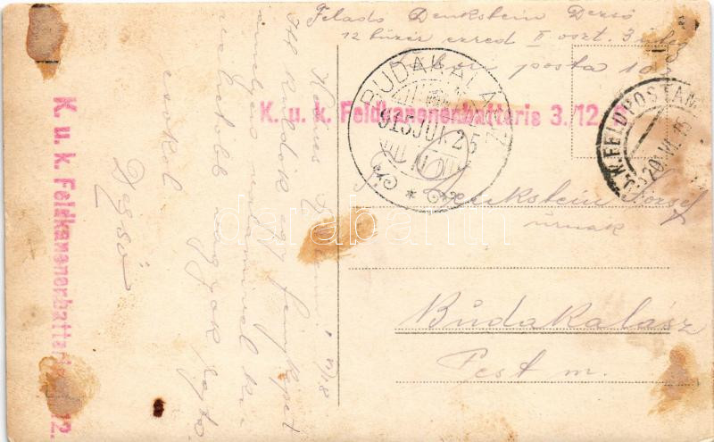 1915 Osztrák-magyar tüzérek csoportja kutyával / WWI Austro-Hungarian K.u.K. military artillery, group of soldiers with dog. photo + "K.u.K. Feldkanonenbatterie 3/12. B" "K.U.K. FELDPOSTAMT 102" (ragasztónyom / glue marks)