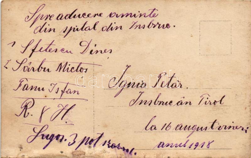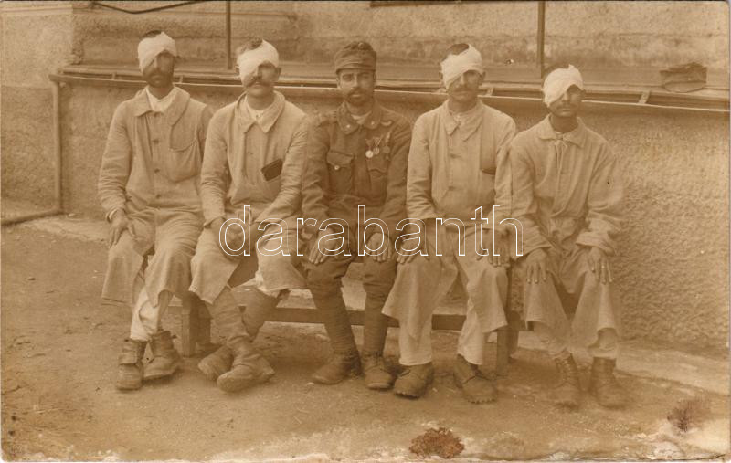 1918 Innsbruck (Tirol), sérült osztrák-magyar katonák csoportja a tábori kórház udvarán / WWI K.u.K. military hospital, group of injured soldiers. photo (felületi sérülés / surface damage)