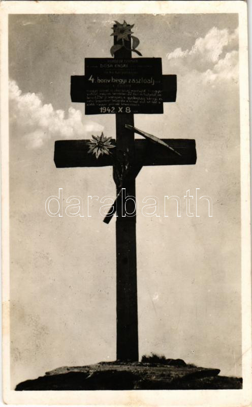Emlékmű a Horthy Miklós csúcson (3205 méter). Felállította a M. kir. kárpátaljai 4. honvéd hegyi zászlóalj 1942. október 7-8-án megtartott harcgyakorlat alkalmával. Bozsuk Gy. kiadása / WWII Hungarian military, monument, mountain troops exercise in the Transcarpathian Mountains (gyűrődések / creases)