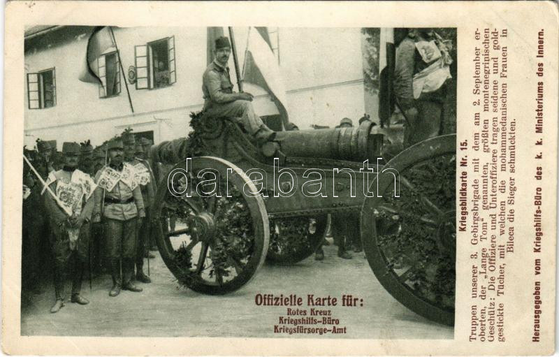 Kriegsbildkarte Nr. 15. Truppen unserer 3. Gebirgsbrigade mit dem am 2. September eroberten, der "Lange Tom". Offizielle Karte für Rotes Kreuz, Kriegshilfs-Büro, Kriegsfürsorge-Amt / "Hosszú Tamás" a montenegróiak legnagyobb ágyúja osztrák-magyar katonák által zsákmányolva az első világháborúban / WWI military, Montenegrin captured cannon "Long Tom" with K.u.k. Austro-Hungarian soldiers (EB)