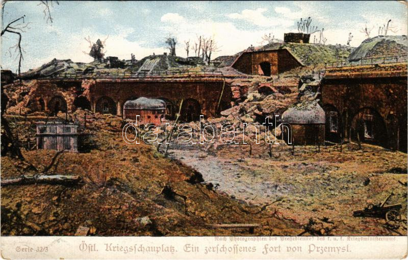 Östl. Kriegsschauplatz. Ein zerschoffenes Fort vom Przemysl. Serie 32/3. Ausgabe des Kriegsfürsorgeamtes Wien / WWI German and Austro-Hungarian K.u.K. military art postcard (kopott sarkak / worn corners)