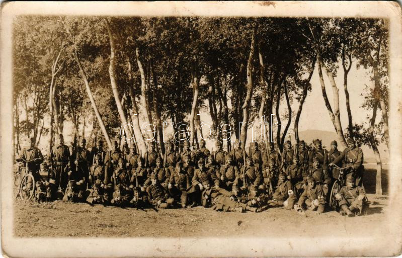 Osztrák-magyar katonák csoportja, köztük szanitécek és kerékpáros katonák / WWI K.u.K. military, group of soldiers and medics. photo (kopott sarkak / worn corners)