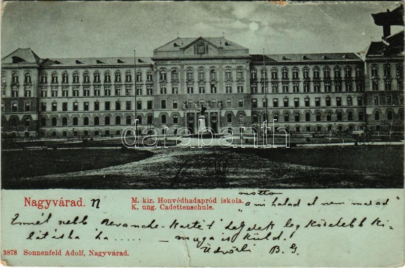 1899 Nagyvárad, Oradea; M. kir. Honvéd hadapród iskola este holdfényben. Sonnenfeld Adolf kiadása / Austro-Hungarian K.u.k. military cadet school at night in moonlight (szakadások / tears)