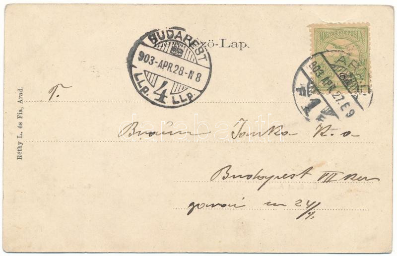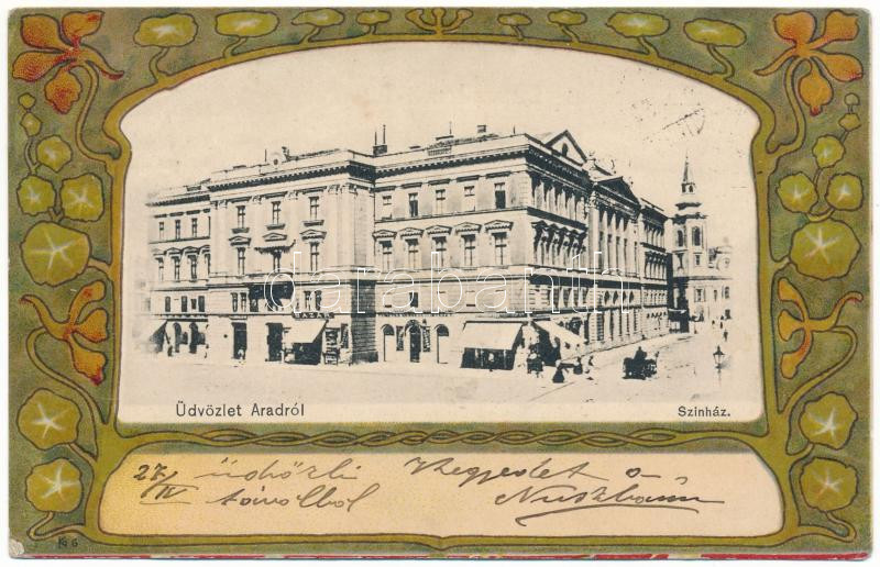 1903 Arad, Színház, bazár, üzletek, temetkezési intézet. Réthy L. és Fia kiadása, szecessziós-virágos litho keret / theatre, bazaar, shops, funeral company. Art Nouveau, floral litho frame (kopott sarkak / worn corners)