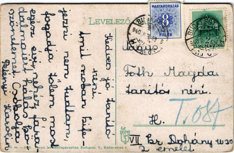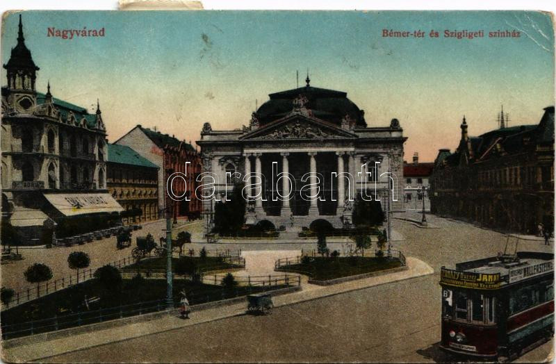 1940 Nagyvárad, Oradea; Bémer tér, Szigligeti színház, EMKE kávéház, Adria biztosító, villamos Wallerstein, Janky üzletének reklámjával. Vasúti levelezőlapárusítás 55. sz. 1916. / square, theatre, café, insurance company, tram with shop advertisements (EB)
