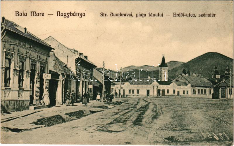 Nagybánya, Baia Mare; Str. Dumbravei, piata fanului / Erdői utca, szénatér, Kovács Lajosné üzlete. Kovács Gyula kiadása / square, shops (tűnyomok / pinmarks)