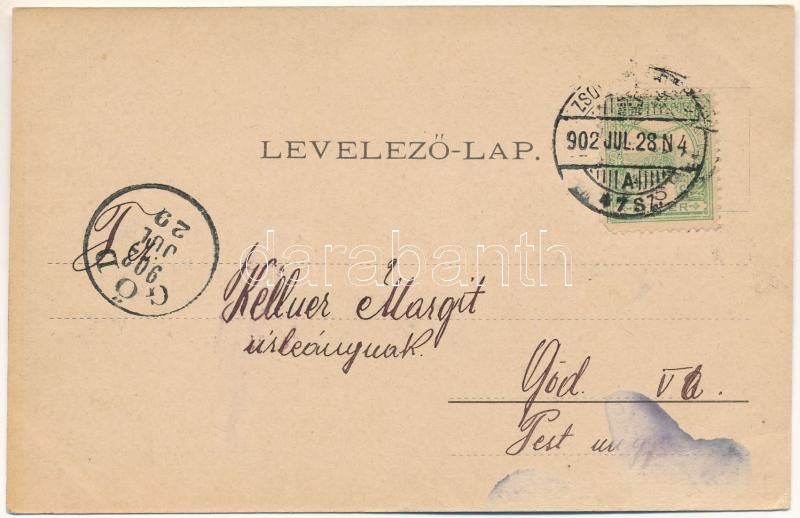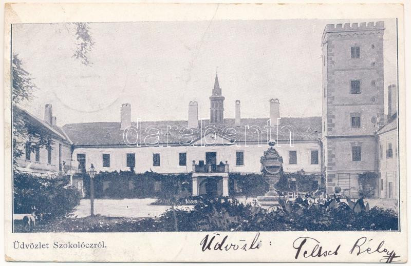 1902 Vágszakály, Szokolócz, Sokolovce; Nyáry kastély / castle + "ZSOLNA - POZSONY 47. SZ. A" vasúti mozgóposta bélyegző (fa)