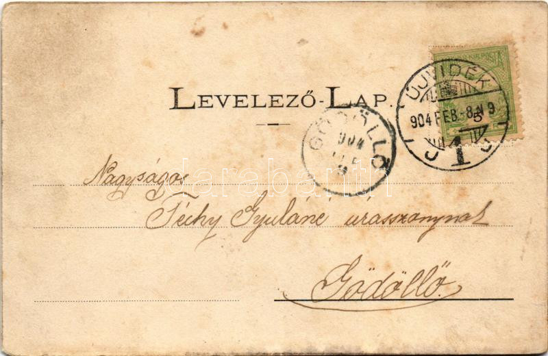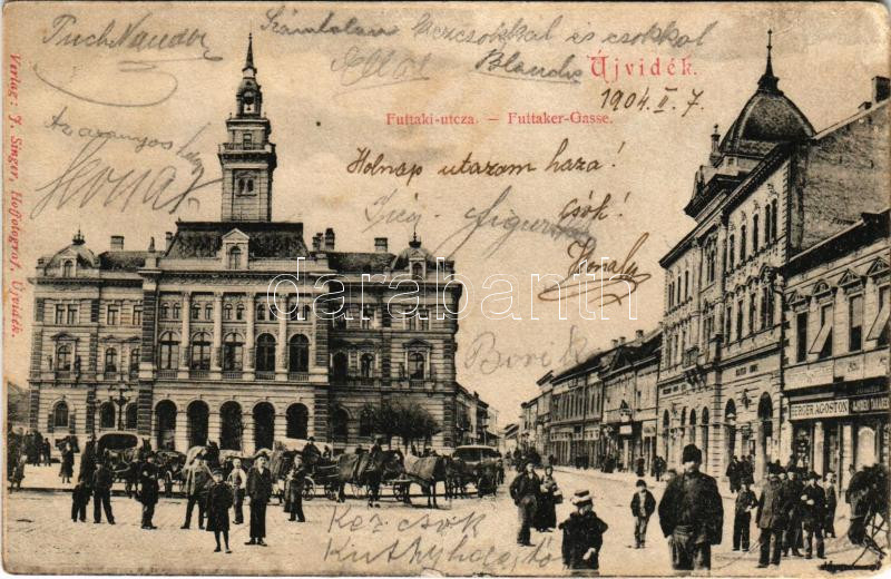 1904 Újvidék, Novi Sad; Futtaki utca, városháza, Herger Ágoston üzlete, Újvidéki Takarékpénztár. J. Singer fényképész kiadása / Futtaker-Gasse / street view, town hall, shops, savings bank (r)