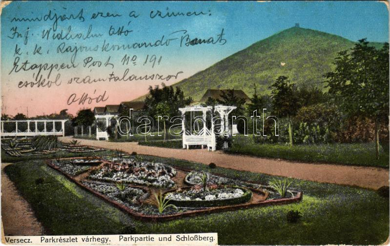 1915 Versec, Werschetz, Vrsac; Parkrészlet és várhegy. Gábor Lajos kiadása No. 5430. / Parkpartie und Schlossberg / park and castle hill (kopott sarkak / worn corners)