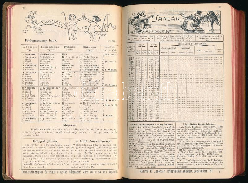 1898 Kincses Kalendárium. Bp., Budapesti Hírlap-ny., XVI+464 p. Egészvászon-kötésben, kissé viseltes borítóval, hiányzó címlappal, egy-két sérült lappal.
