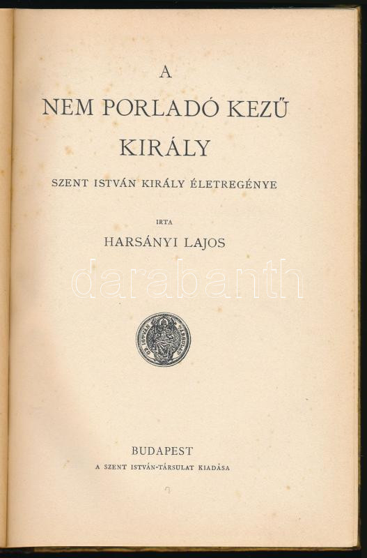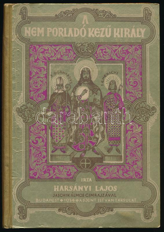 Harsányi Lajos: A nem porladó kezű király. Szent István király életregénye. Bp., 1934, Szent István-Társulat, 244 p. A borító Jaschik Álmos munkája. Kiadói félvászon-kötés, néhány foltos lappal.