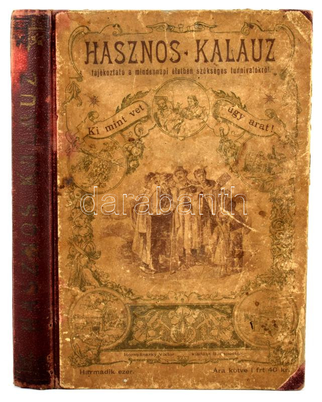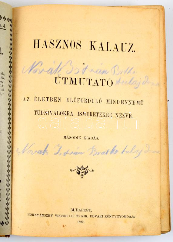 Hasznos kalauz. Útmutató az életben előforduló mindennemű tudnivalókra, ismeretekre nézve. Bp., 1899, Hornyánszky-ny., XVI+313+[1] p. Második kiadás. Kiadói félvászon-kötés, viseltes, széteső állapotban, kopott, foltos borítóval, a lapok egy része kijár.