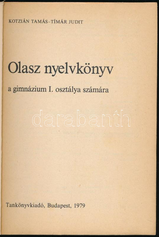 Kotzián Tamás - Tímár Judit: Olasz nyelvkönyv a gimnázium I. osztálya számára. Bp., 1979, Tankönyvkiadó. Kiadói papírkötés, kissé kopottas állapotban.