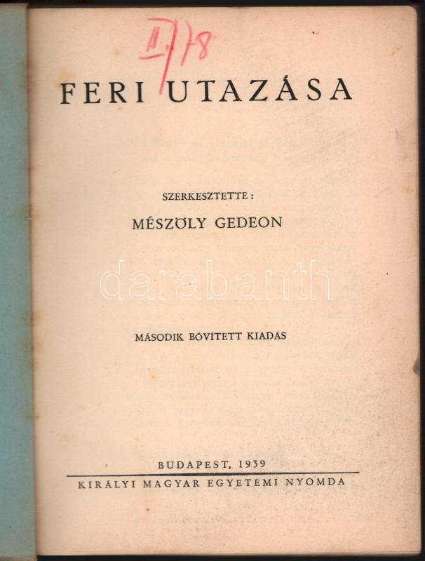 Mészöly Gedeon (szerk.): Feri utazása. Bp., 1939, Kir. Feszty Masa által tervezett irredenta borítóval. Magyar Egyetemi Nyomda. Kiadói papírkötés, kopottas állapotban.