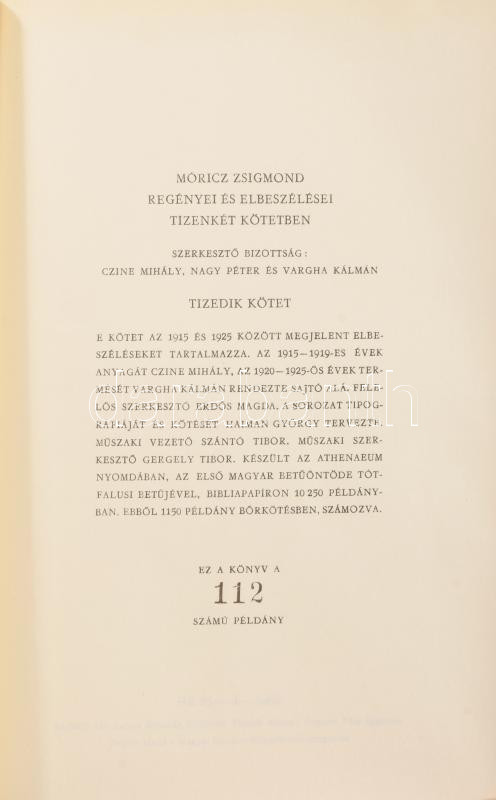 Móricz Zsigmond regényei és elbeszélései 1-12. köt. Szerk.: Czine Mihály, Nagy Péter, és Vargha Kálmán. Bp.,1962-1965., Magyar Helikon. A sorozat tipográfiáját és kötését Haiman György tervezte. Számozott példányok, kötetenként eltérő számozással. Kiadói aranyozott egészbőr-kötések, műanyag védőborítóban, az első kötetről hiányzó műanyag védőborítóval, jó állapotban.